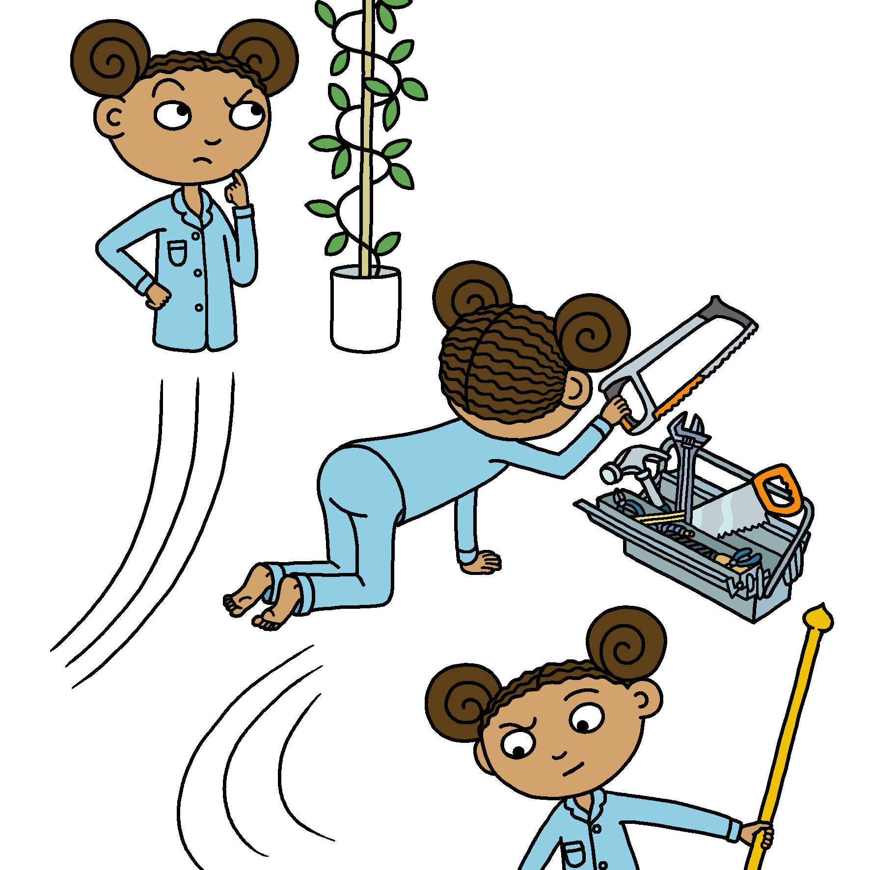 Så kommer hon på det! Hon behöver en gardinstång. En handske. Tejp. Och bomull. Sen är det bara att börja uppfinna ... en tänd-arm!